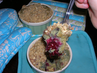 The original recipe calls for blueberries although Dorie says you can use any berry except strawberries, which are too watery. I chose blackberries because I love them and love the tart and sweet combination of blackberry cobblers. This was equally a great combo. The recipe also calls for orange or lemon rind rubbed into sugar. I used orange, and it turned the sugar a most glorious saffron yellow! It also added a nice, subtle orange flavor to the cake. I was actually surprised that I could distinctly taste it after baking. Instead of using all walnuts for the topping, I used walnuts, cashews, and almonds; mainly because I had them on-hand. I decided to make muffins and filled 12 muffin tins almost to the top. There was still batter left over so I filled two ramekins. I really should have left more room for the muffins. They poofed and went flat on top instead of doming like regular muffins. The crumble didn't want to stay on very well and looks spotty. It seemed to be trying to escape the muffins. Both problems would have been solved if they had room to rise just to the top of the tin. Despite looking like a bunch of mutts, they taste delicious. The ramekins fared much better looks-wise and taste pretty much the same - yum!