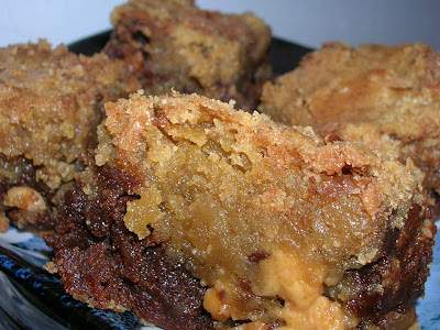 A big thanks to Beth of Supplicious for picking Chipster Brownies. In case you haven't guessed, chipster brownies are brownies topped with a layer of chocolate chip cookie. Oh yes, you heard right, this duo is out to blow other little brownies to pieces! Everything went smoothly with the recipe...until I got to the part where you spread the chocolate chip cookie dough on top of the brownie batter. My cookie dough was so heavy that it wanted to plummet straight to the bottom of the pan. I had brownie batter sputtering out in mini geysers. It was kinda a mess, and the resulting brownies look more marbled in the middle than they're probably supposed to. I was happy when I finally got the dough covering the whole top and popped it in the oven. As I set out to clean-up, I found an egg in the 1/4 cup measuring cup. Huh? Who put that there? Wasn't that supposed to go into the...cookie dough. Huh, I wonder if that's why it was so hard to spread?