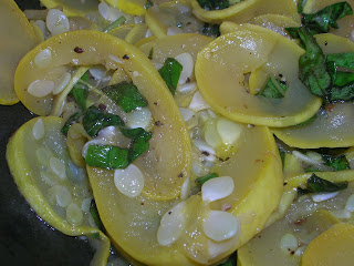 I haven't cooked a lot with basil, so I googled it up and found a simple recipe on Epicurious that also would use the yellow summer squash I'd bought by the pound. I was surprised by this recipe. Usually when I see smothered, I think cheesey and rich, as in "scattered, smothered, covered, chunked." This smothered is from Cajun cuisine, meaning to brown in oil, then braise in a small amount of liquid, tightly covered, until tender. I altered the recipe by adding more basil. It went so well with the squash and made an amazingly good dish.